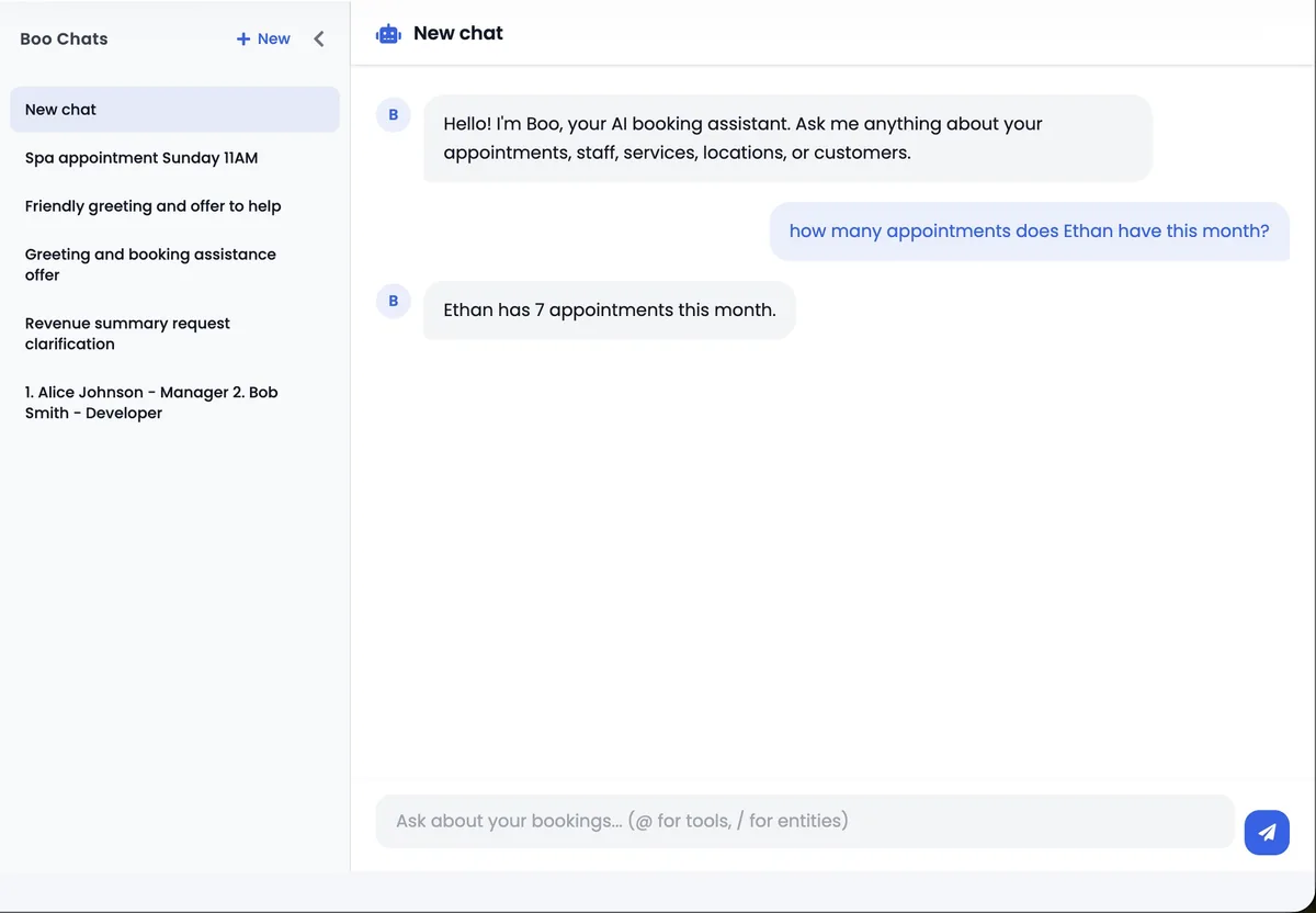 Boo AI has access to 31 management tools covering appointments, staff, services, locations, customers, revenue analytics, and payment stats. It can list, create, update, and delete records — and always asks for confirmation before making changes.