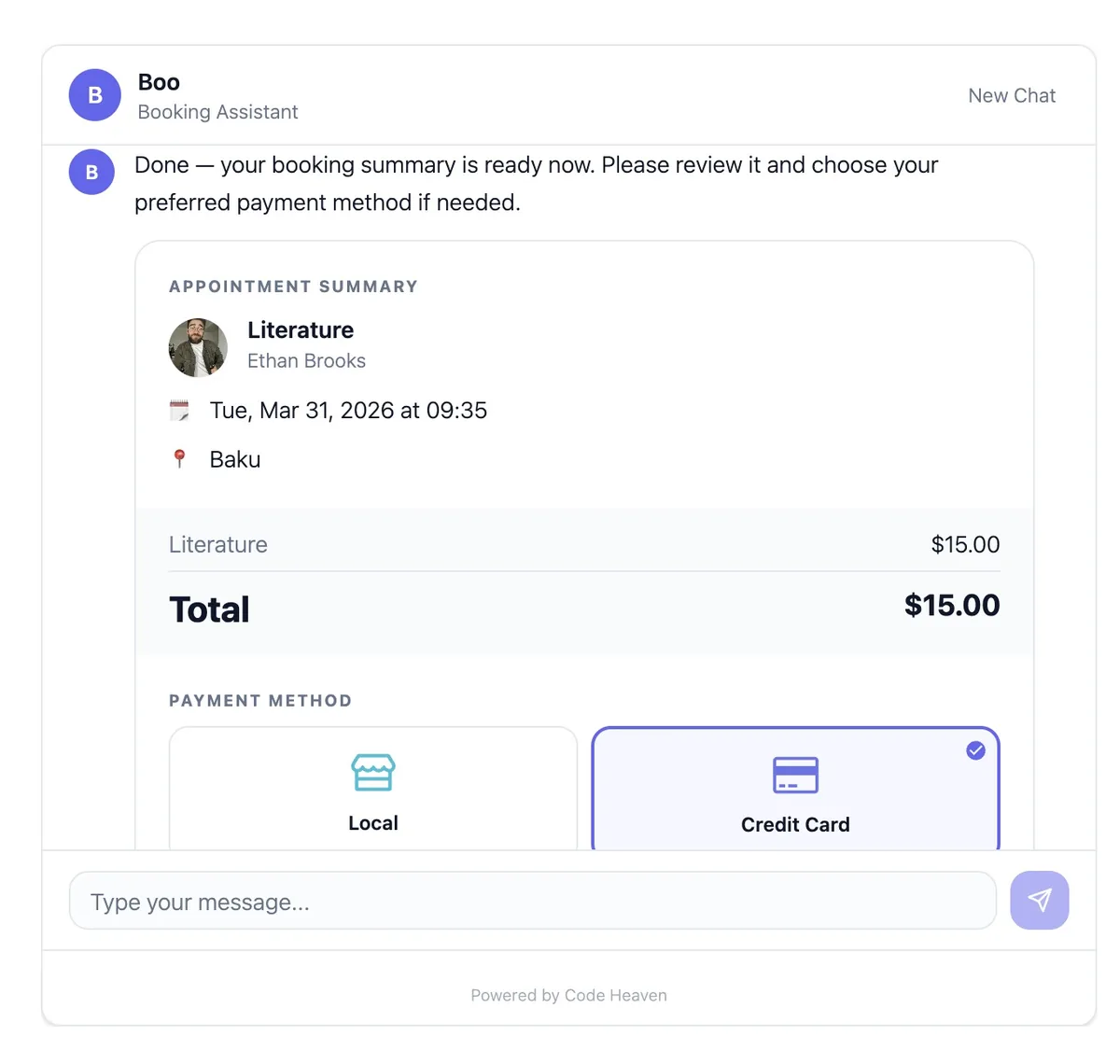 For online payments (Stripe, PayPal), a secure modal opens for card entry. Boo AI monitors the payment status and confirms when the transaction is complete. The customer never leaves the chat.