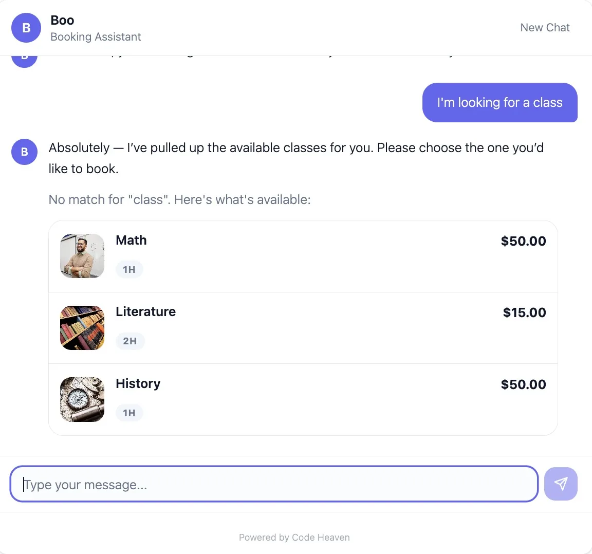 From there, the experience feels like messaging a knowledgeable receptionist. The customer describes what they need, and Boo AI guides them through the booking flow with interactive UI elements — not just text responses.