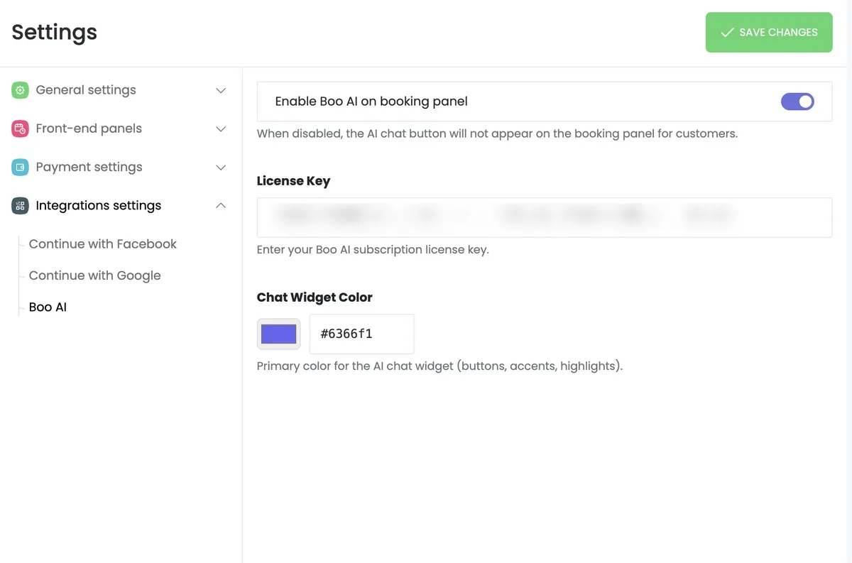 The entire Boo AI setup — toggle, license key, and color picker. Three fields, no API configuration.