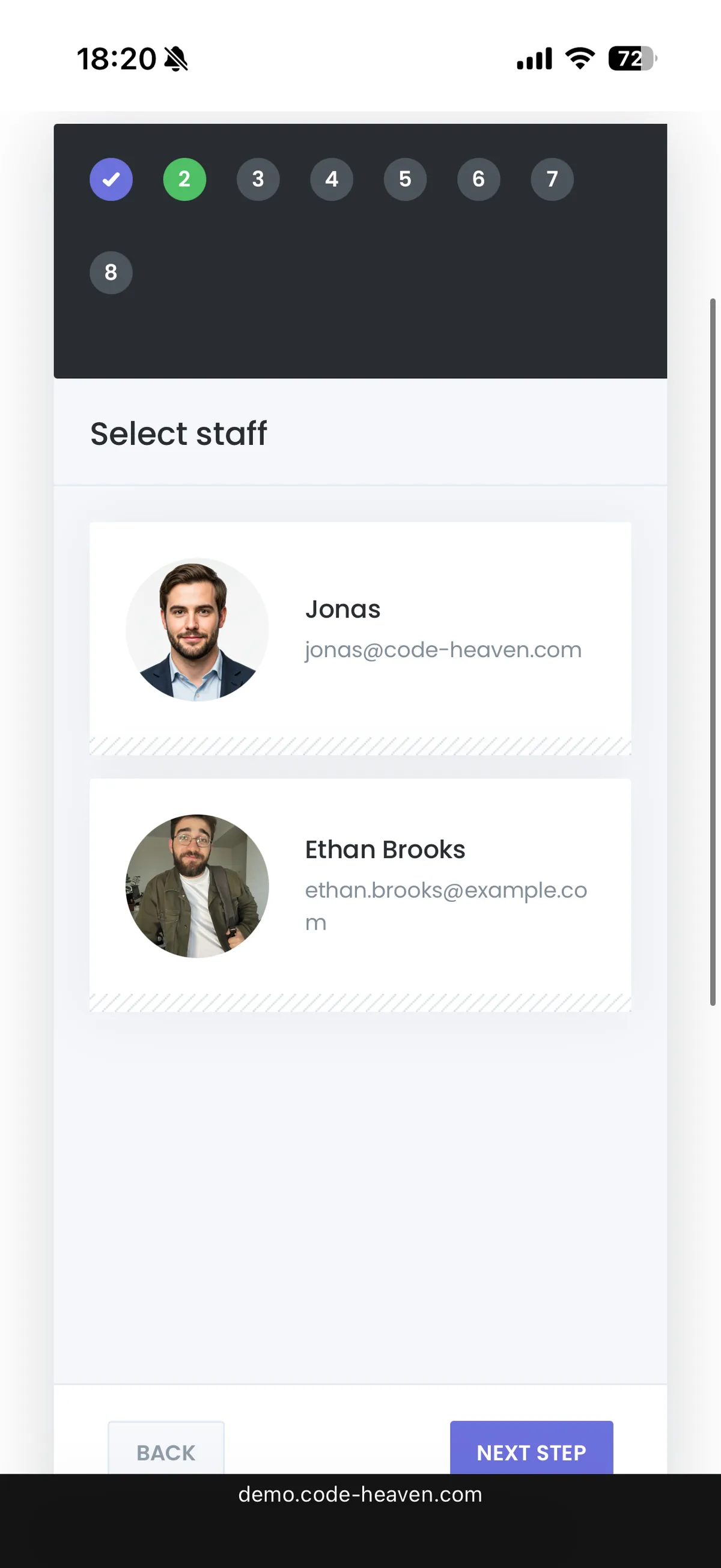 A traditional Booknetic booking form on mobile — an 8-step wizard where customers click through steps to select staff, date, time, and more.